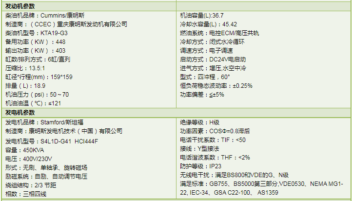 400kw康明斯發(fā)電機(jī)的參數(shù)